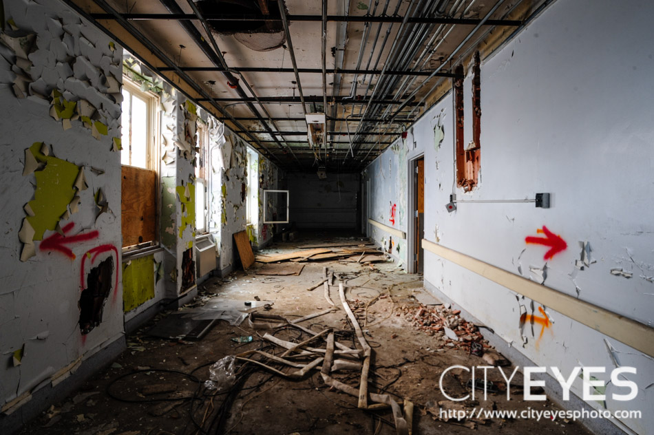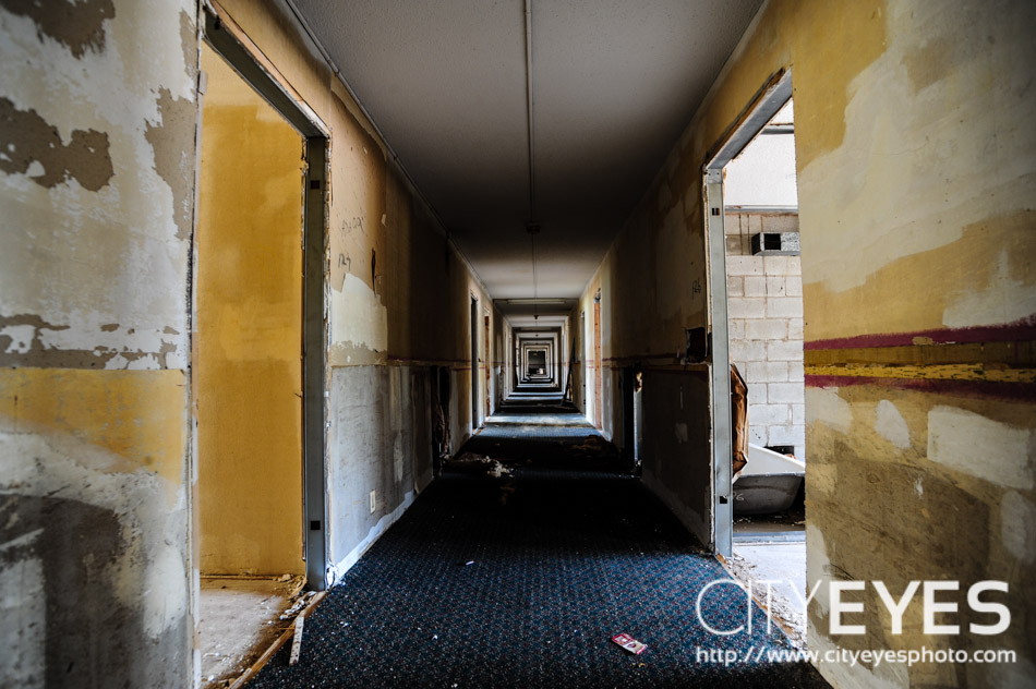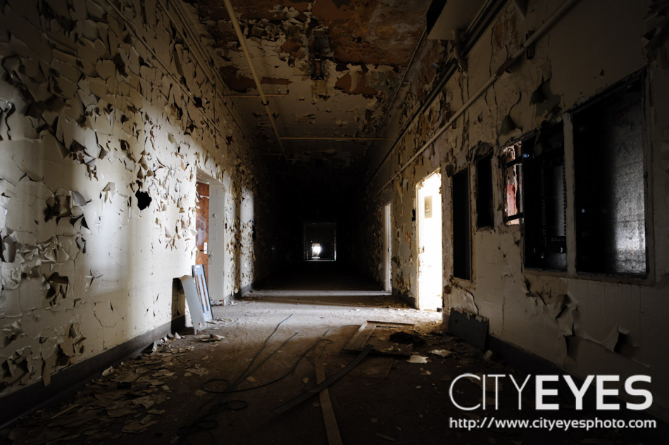The halls were dark, full of furniture and debris. Peeling paint coats floors that have paint, other halls are lined with tile that has not yet fallen off.