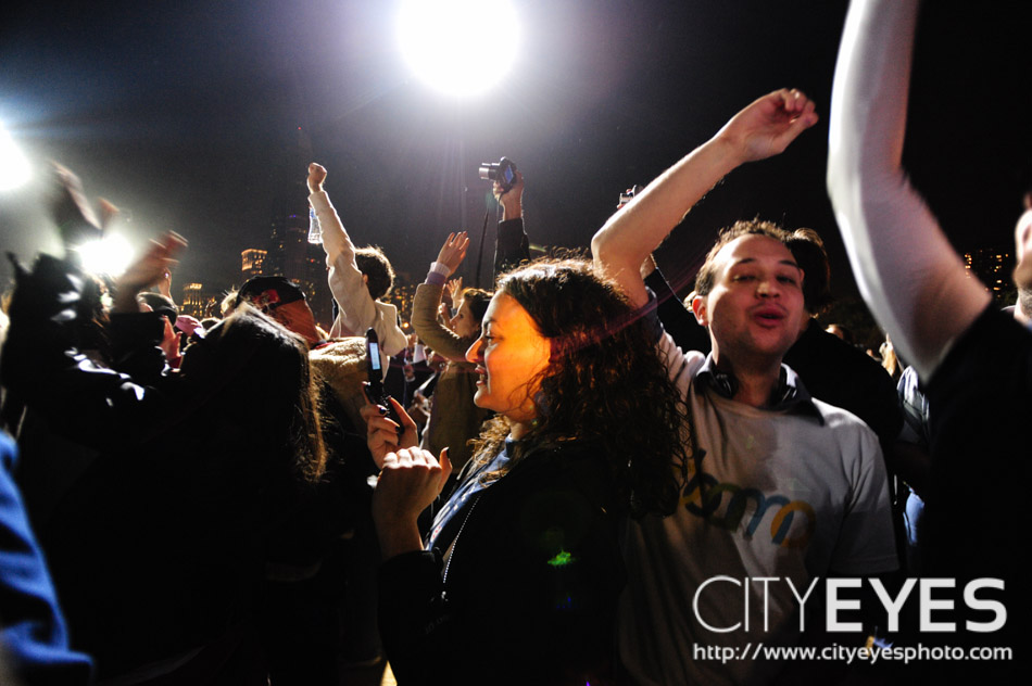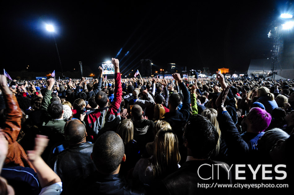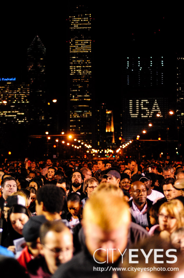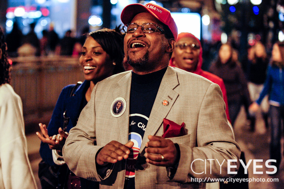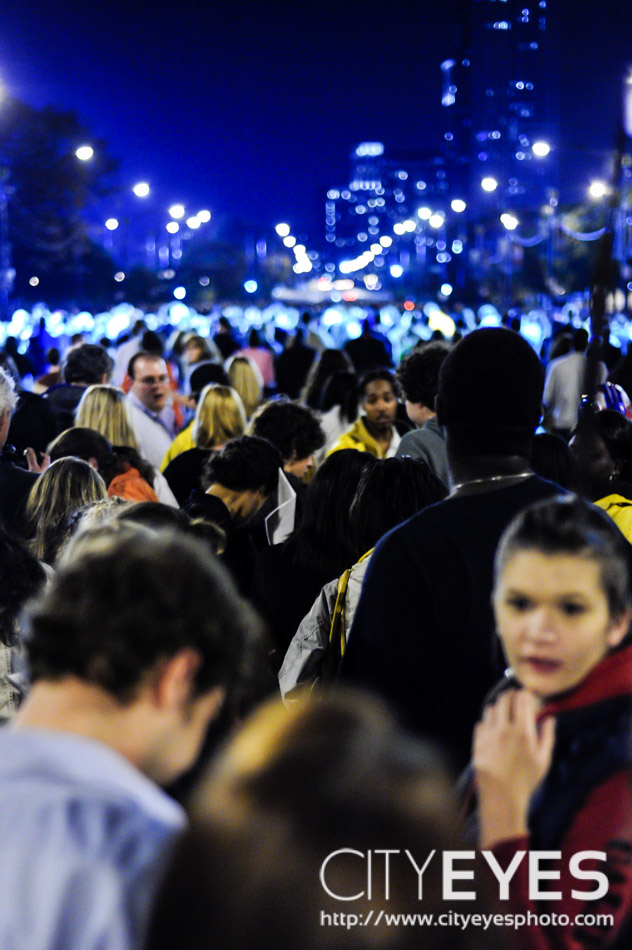 The crowds were crazy on the way out, but oddly controlled. We all walked happily out there with literally no problems. People were happy, shouting Obama, dancing, playing music, waving flags. All down usually packed-with-cars Chicago streets.