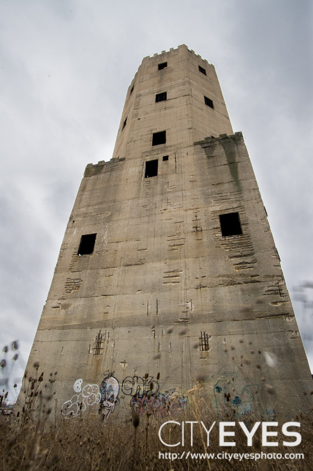 The second silo, oddly, looks like a gigantic castle. We didn’t know exactly where it was, but we followed it’s hulking presence on the horizon until we finally were able to park across the street and wander to it from there. We walked along some tracks until we were right next to the structure.