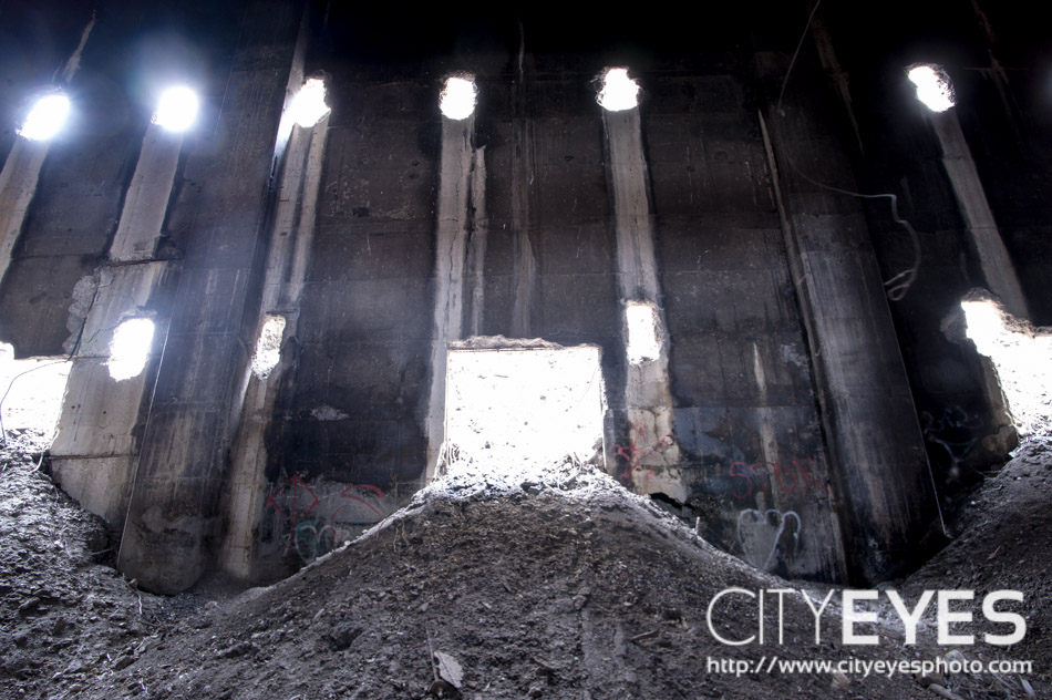 The inside of the first part of the silo was dark and full of dirt. Long rains had obviously washed in every surrounding bit of soil, which cascaded in through the windows. Small holes in the concrete let the light in. Unfortunately, there was no way to the higher floors as time had taken its toll on the steel ladders, which were either sprawled on the floor or barely intact.