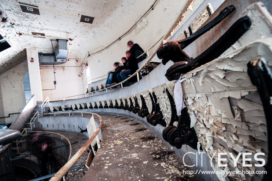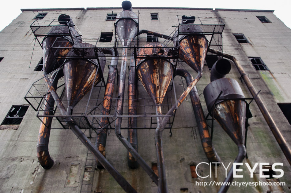 We climbed up the hulking structure, crossing frighteningly decayed cement walkways to get to another section where we could climb to the top. I took a quick photo of some of the coolest industrial equipment I’d ever seen: